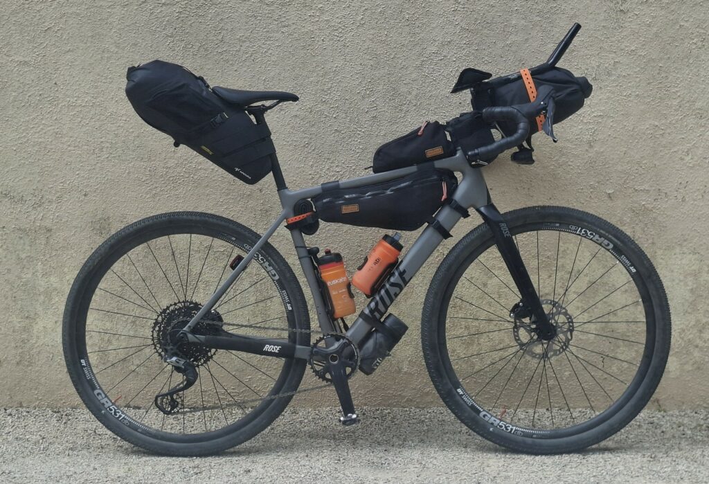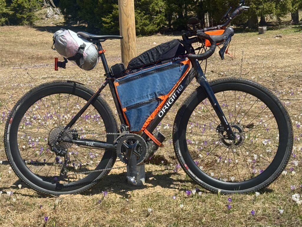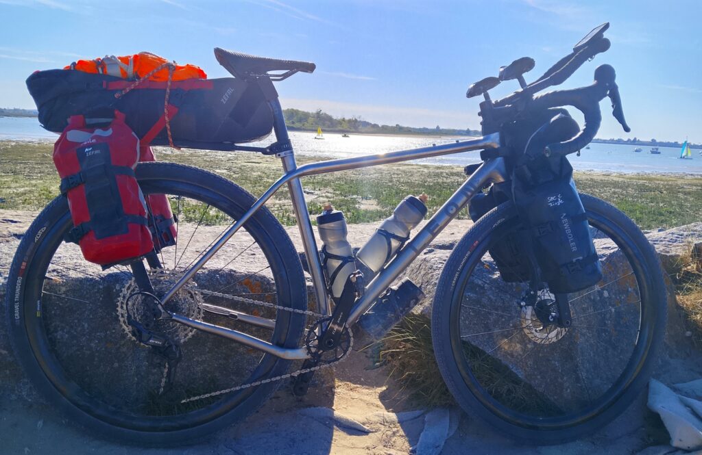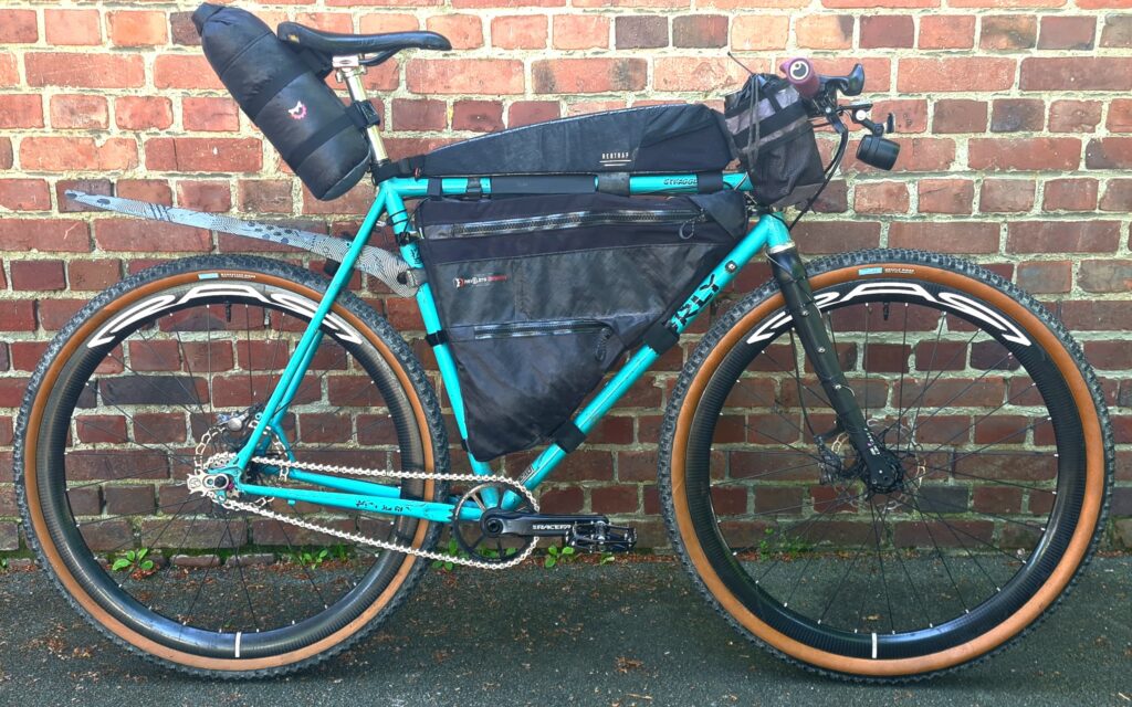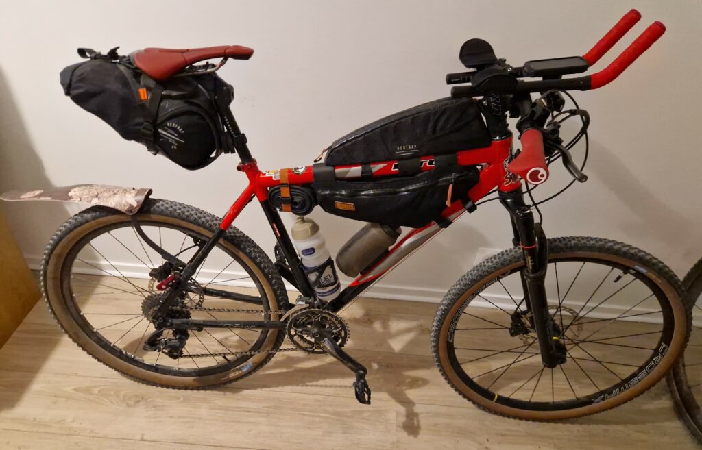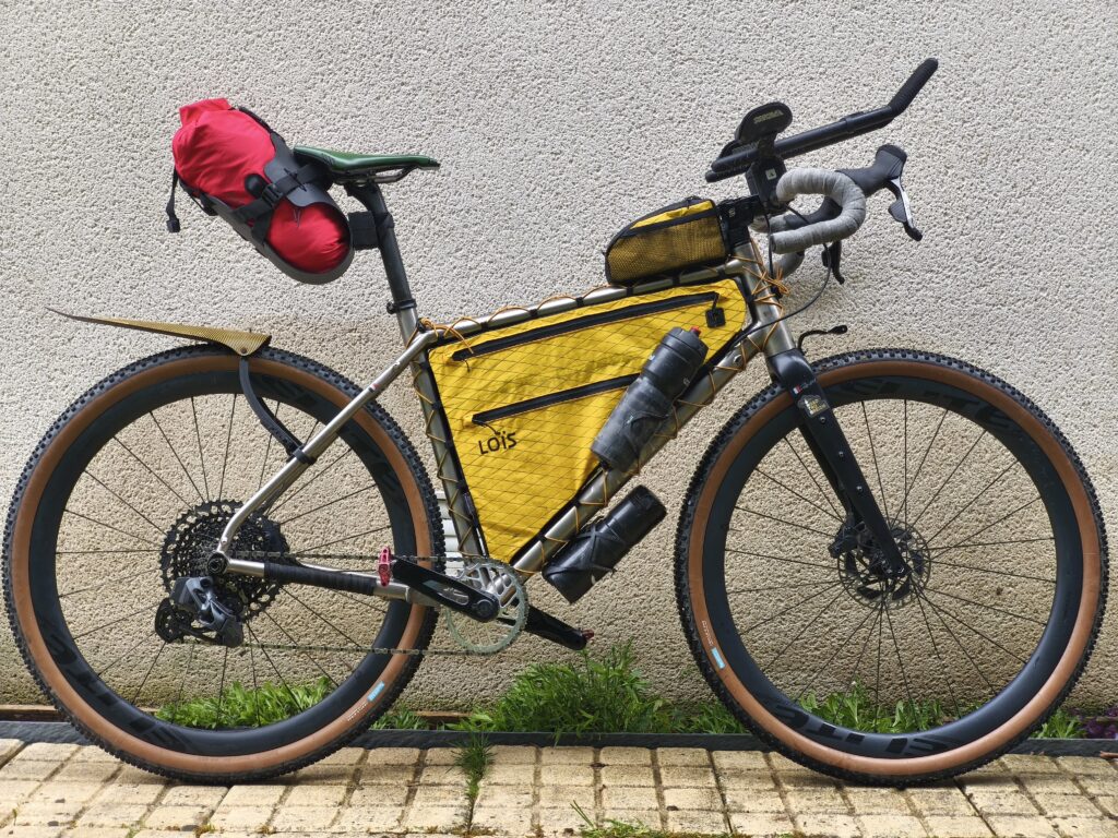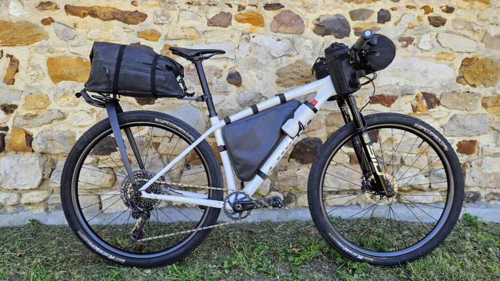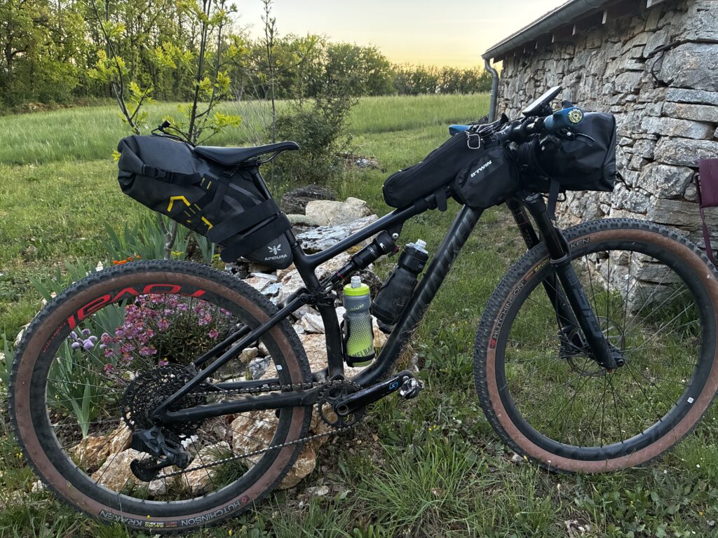 Bagagerie : sacoche de selle Restrap (couchage et rechange), top tube Restrap (électronique), sacoche de cadre Revelate (vêtements de pluie, outils, produits sanitaires), petite sacoche de guidon SRAM (barre de céréales).