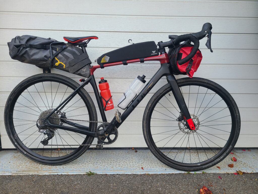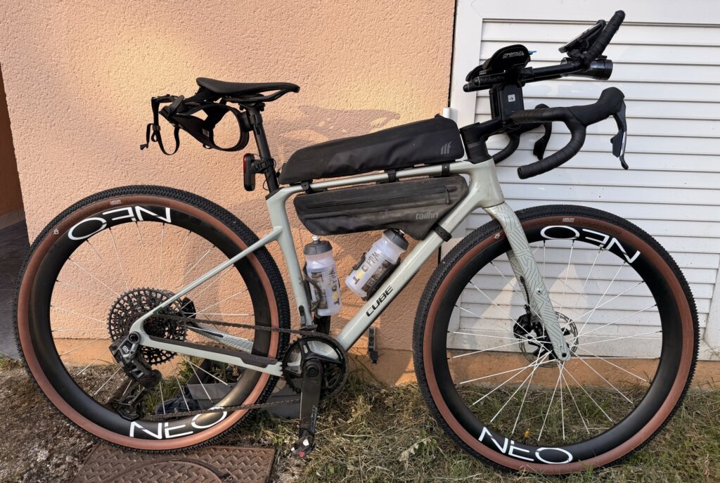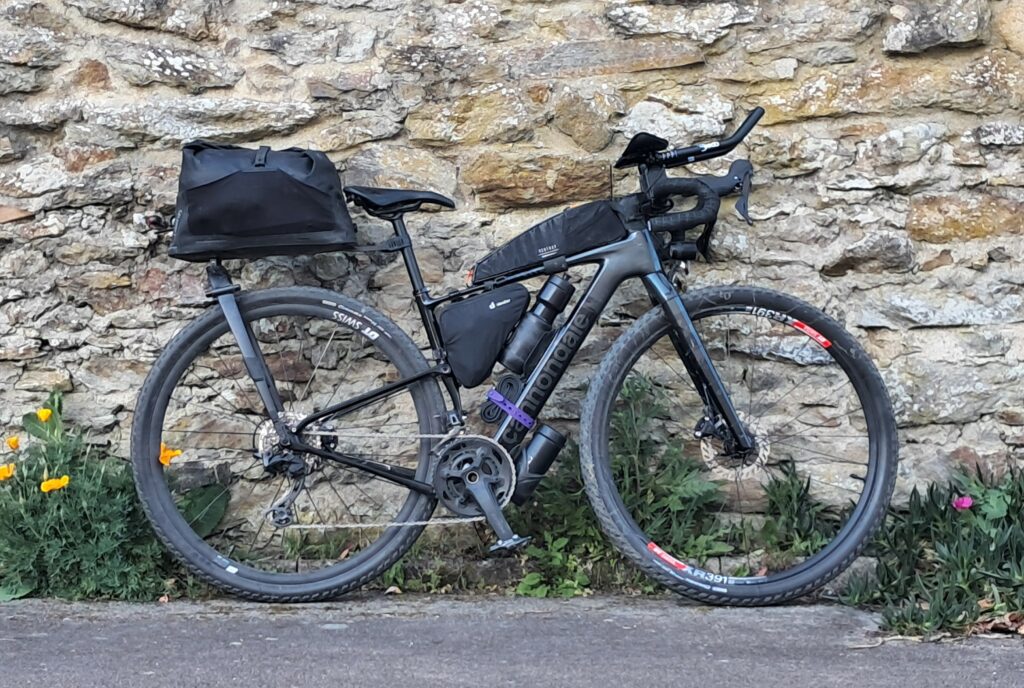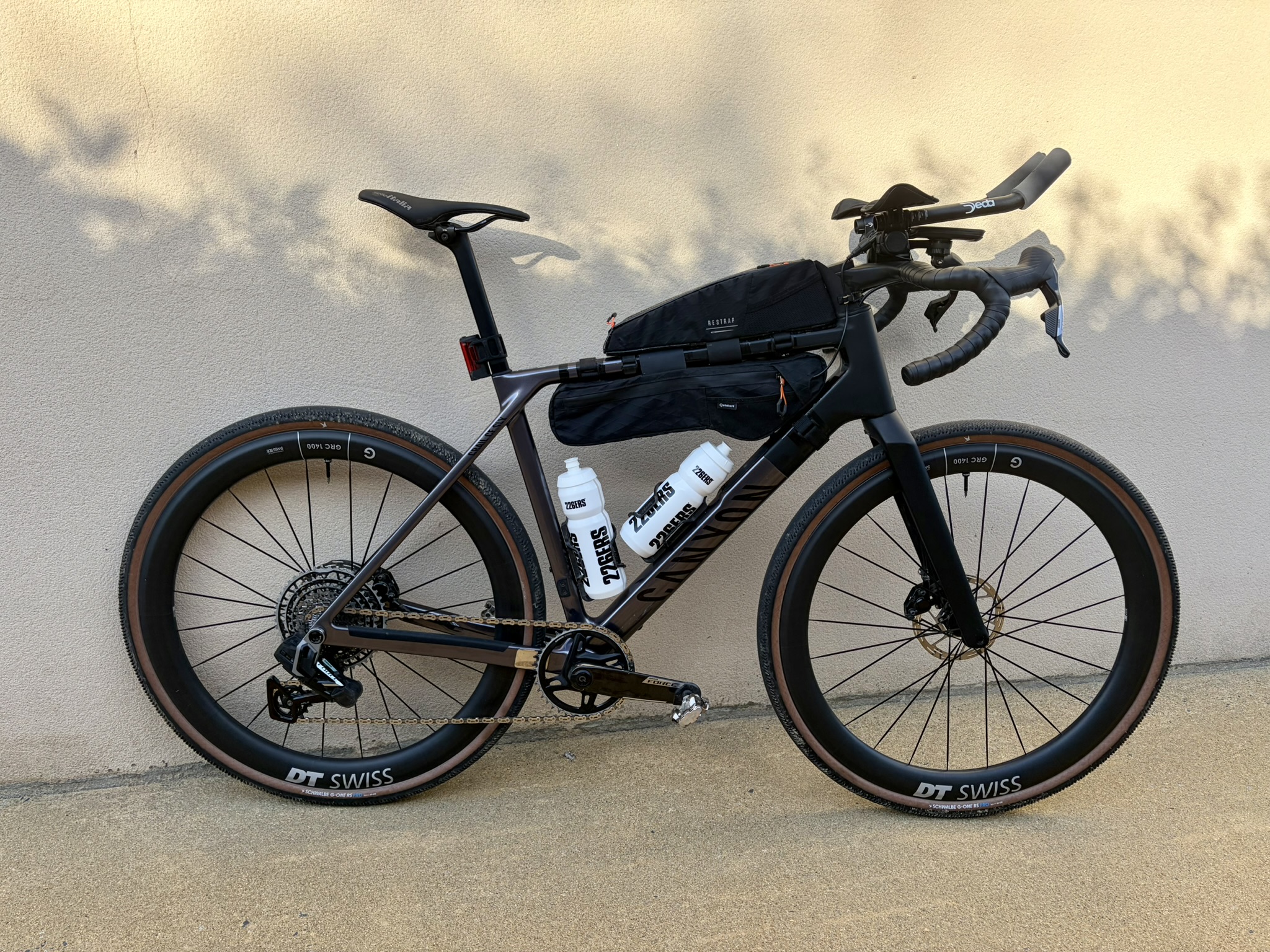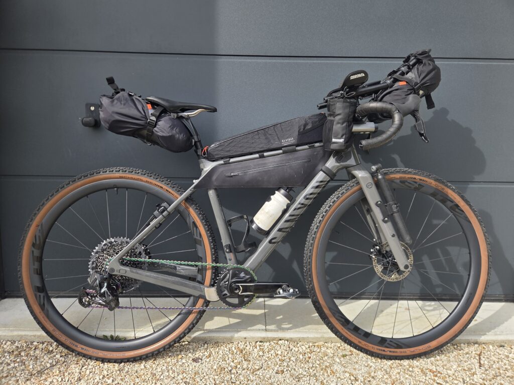 Vélo : Cannondale Topstone Carbon 3, grx 2×12, pédalier 46/30, cassette 11-36. Roue avant, dtswiss XR391 équipée d’un moyeu SON delux pour rentabiliser les coups de pédales. Roue arrière, dtswiss GR1600. Pneu Pirelli Cinturato Gravel M, section 50 à l’avant, 45 à l’arrière.