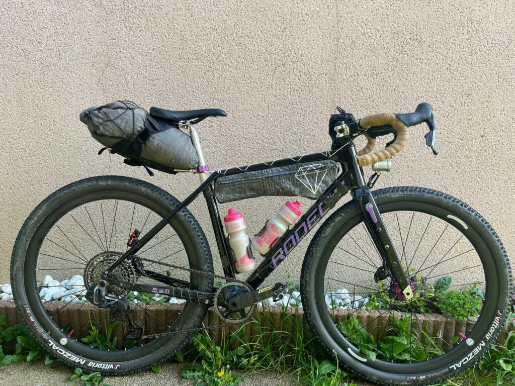 Bagagerie : vêtements secs, pyjama et sac de couchage sont dans la sacoche Apidura 17L à l’arrière. Le reste du couchage et la doudoune sous les prolongateurs à l’avant dans une sacoche maison, hackée sur un sac étanche Vaude. Sur et sous le top tube, le ravito, l’électronique et la veste de pluie sont logées dans deux sacoches Restrap fatiguées. Une boite à outil sous le pédalier, une foodpoche au guidon et un gilet d’hydratation sur le dos complètent la panoplie.