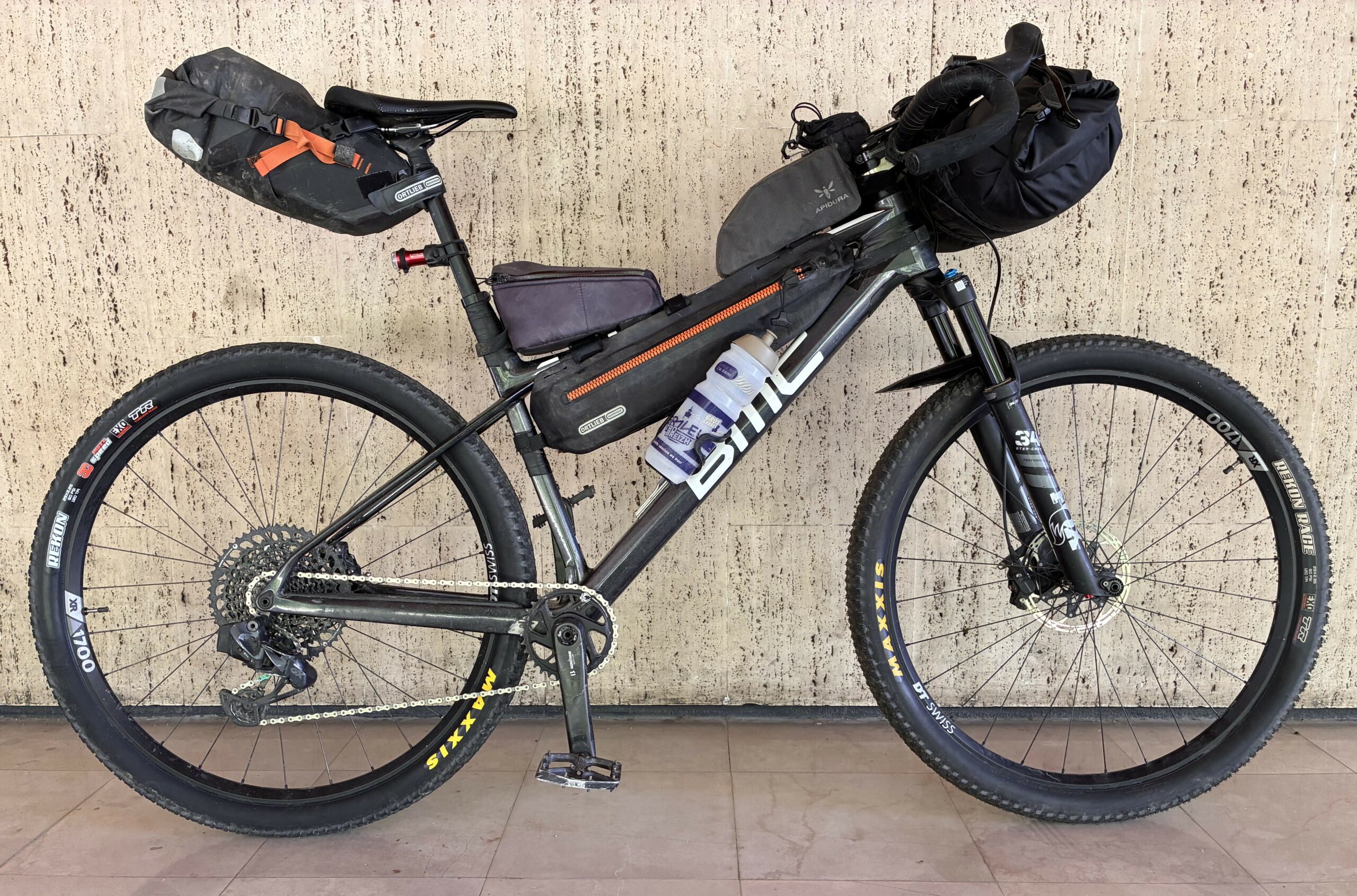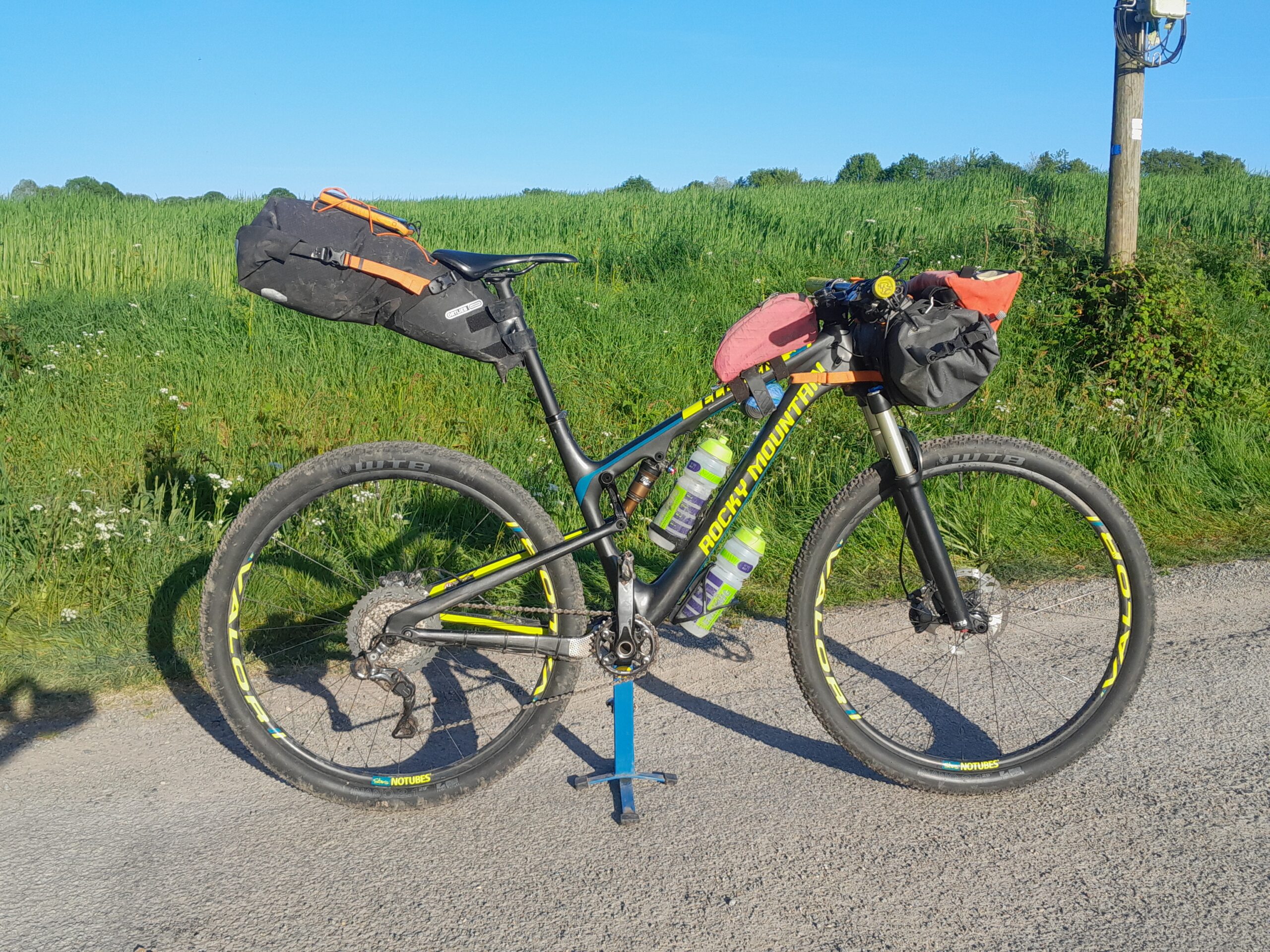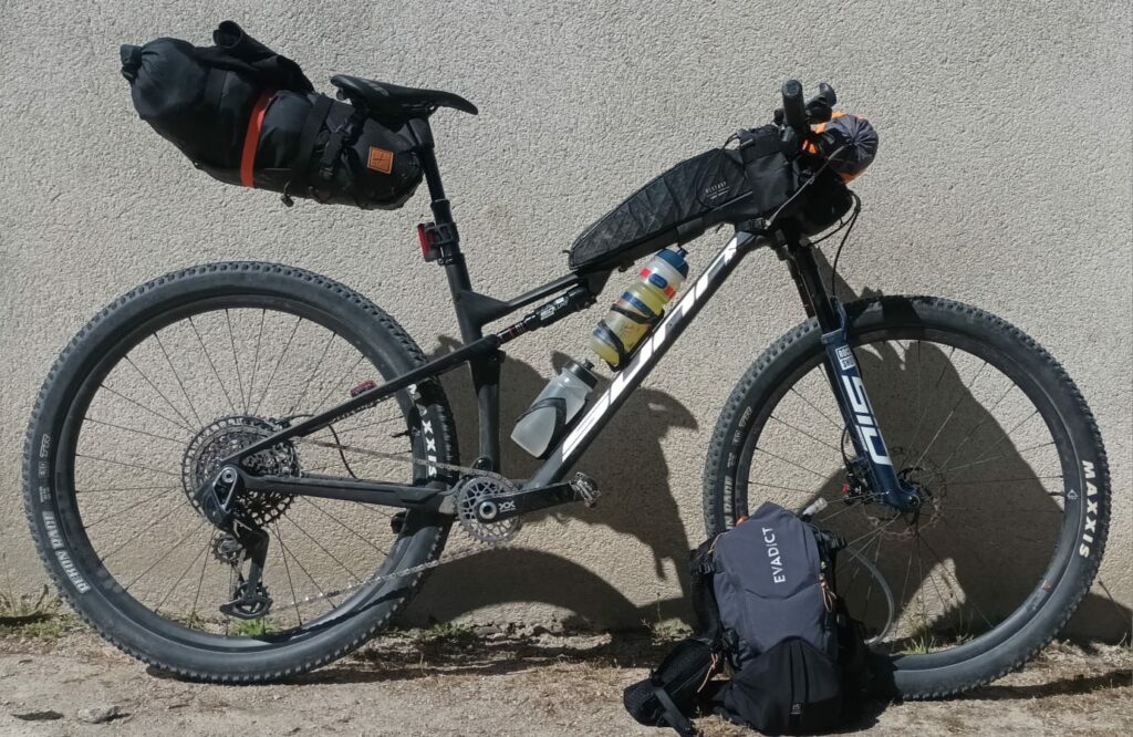 Bagagerie : Sacoche top tube restrap race pour la nourriture. Sacoche de cadre Canyon pour kit réparation et électroniques. Sacoche de selle restrap race 7 litres pour le bivouac. Sacoche de prolongateurs restrap 6 litres pour vêtements de change, vêtements de pluie et surchaussures. Camelback de 2L pour eau et un bidon d’1L d’eau sur cadre et un bidon pour outils. Food pouch.