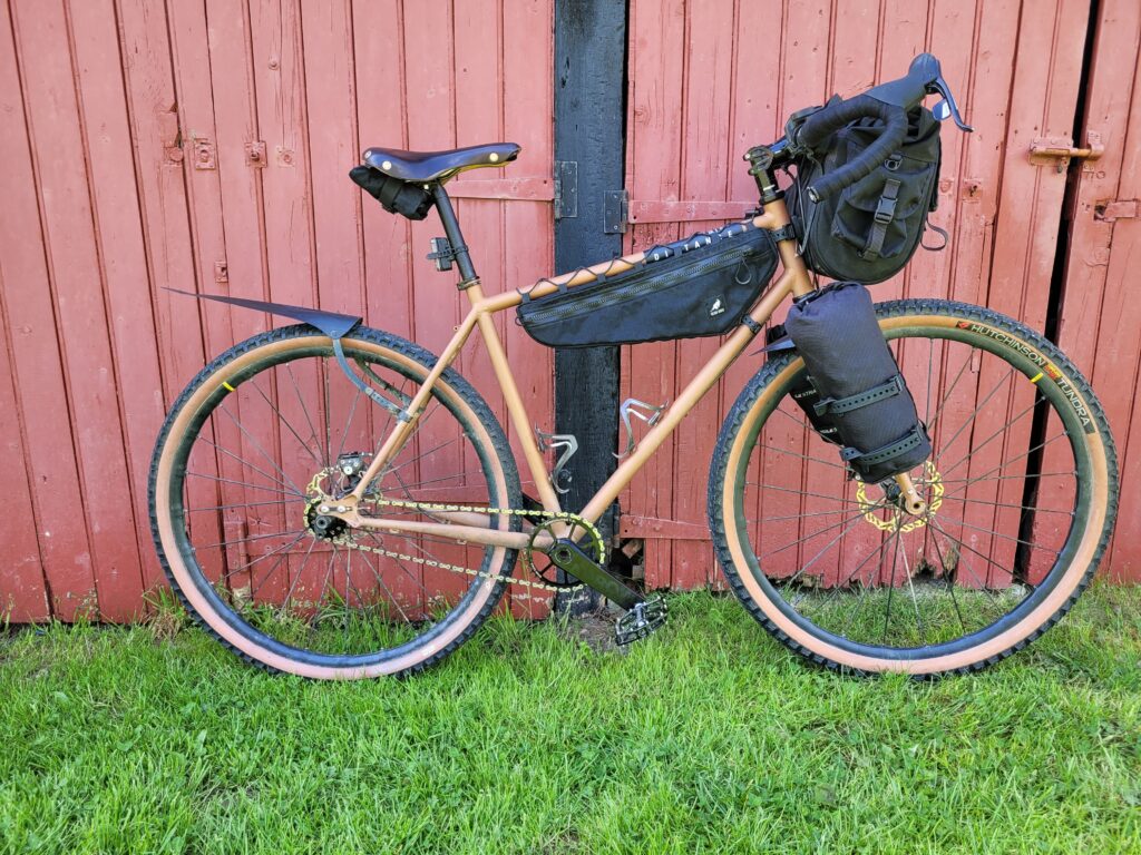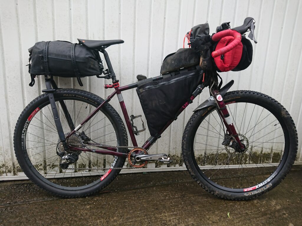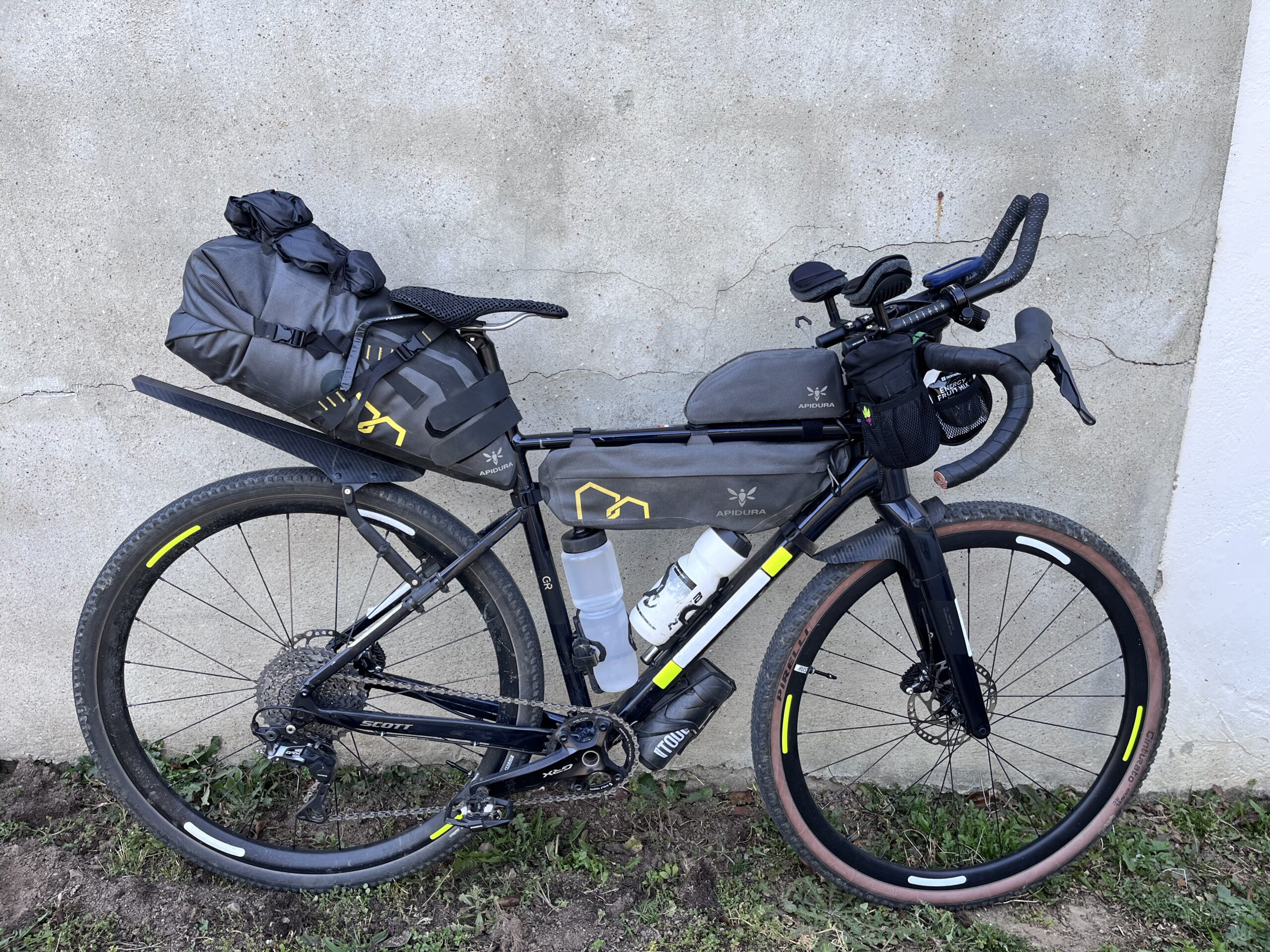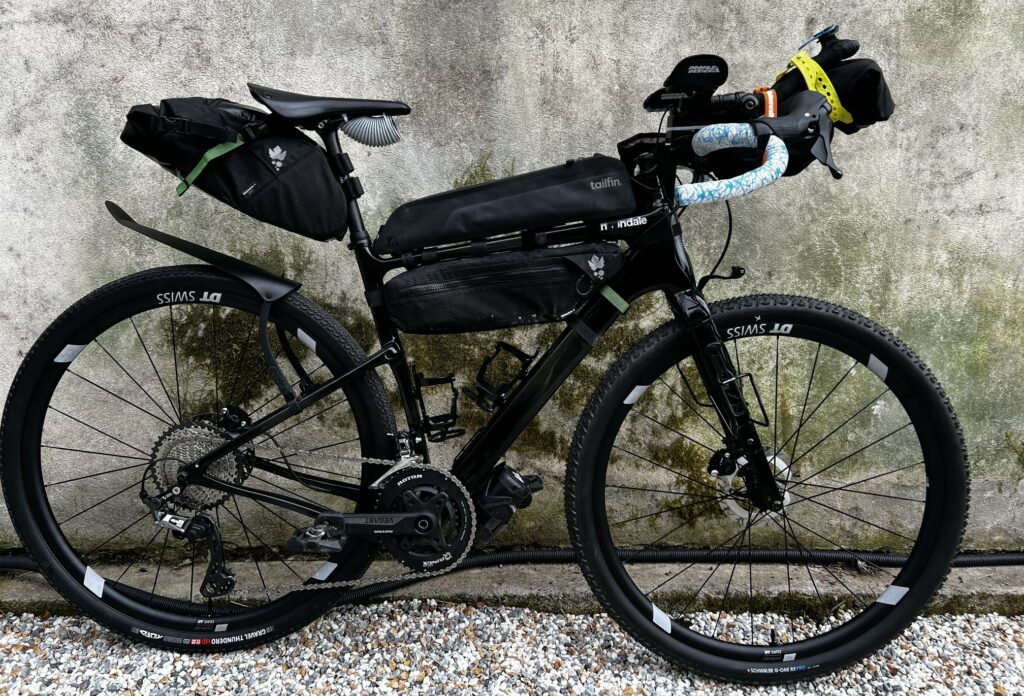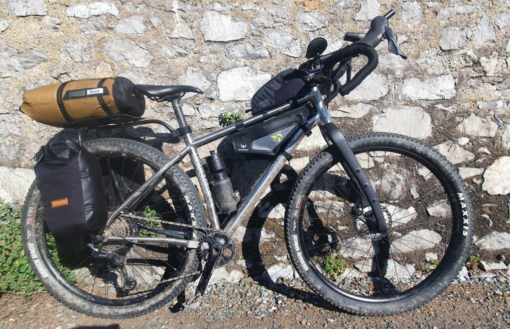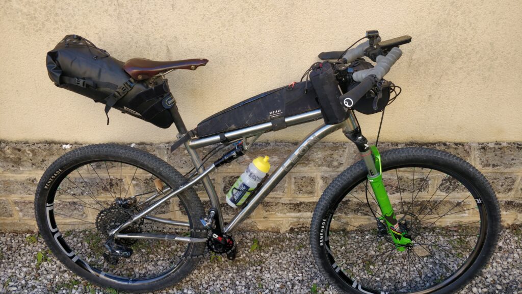 Bagagerie : un peu de tout; Apidura pour la sacoche de selle (rechanges et vêtements pour le froid ou la pluie), Miss Grape et Tailfin pour le cadre (électronique, nutrition, pharmacie), Restrap pour la sacoche de cintre avec bivi, matelas et sac de couchage)