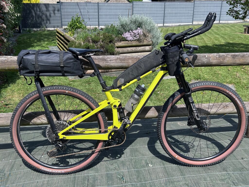 Bagagerie : Sacoche de cadre (3,4l), cockpit (0,8l) et toptube (1l) de chez Canyon + Sacoche de selle (7l) et sac d’hydratation(7,5) de chez Restrap.