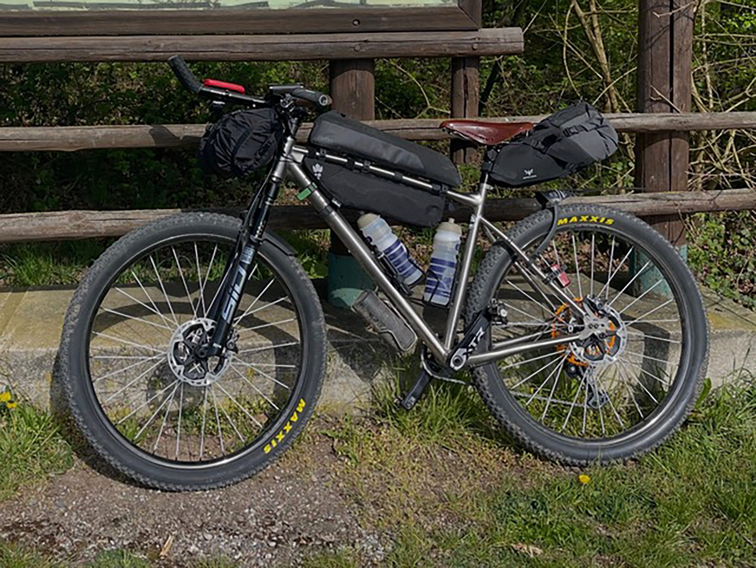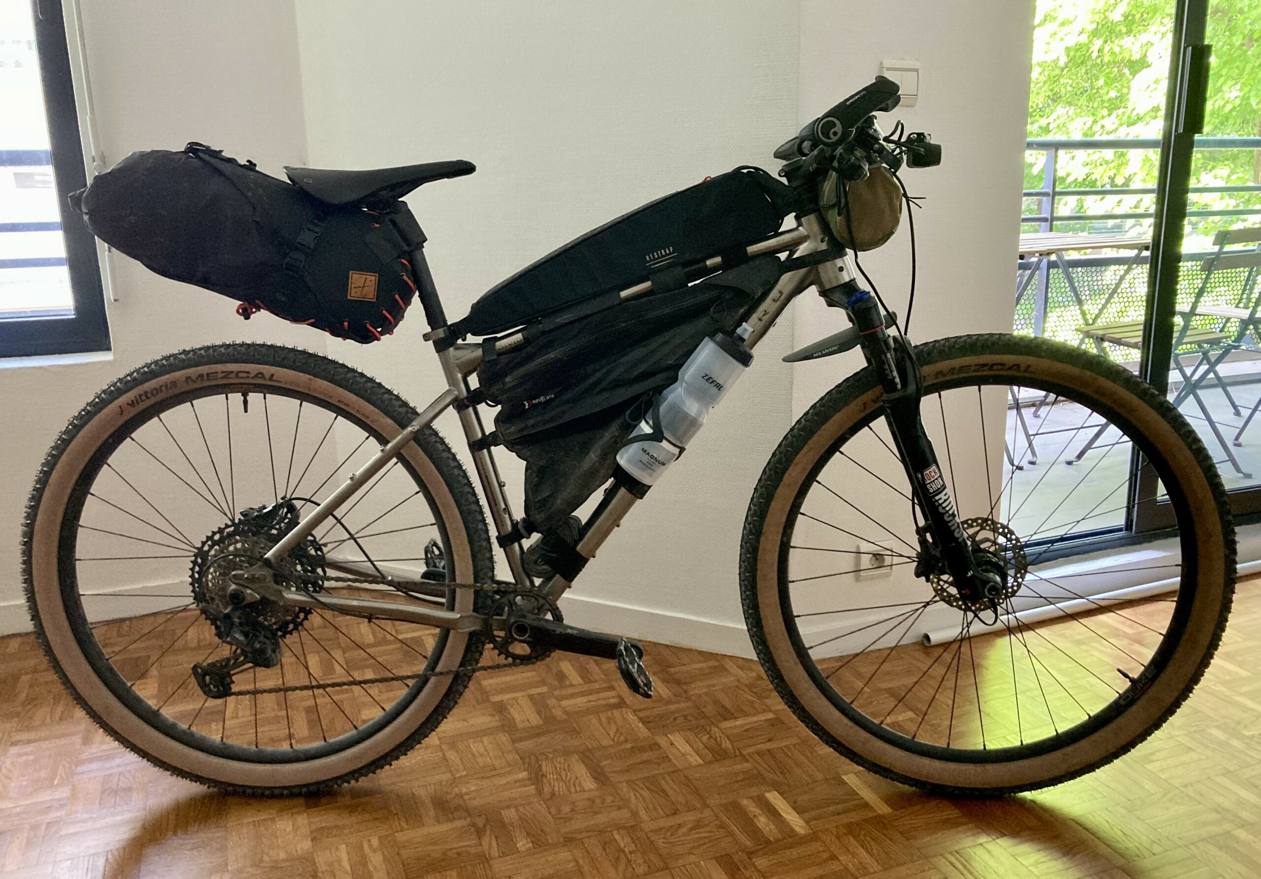 Bagagerie : 4 sacoches (selle / prolongateur / 2 sacoches top tube) avec notamment de quoi dormir (Bivy / matelas / duvet)